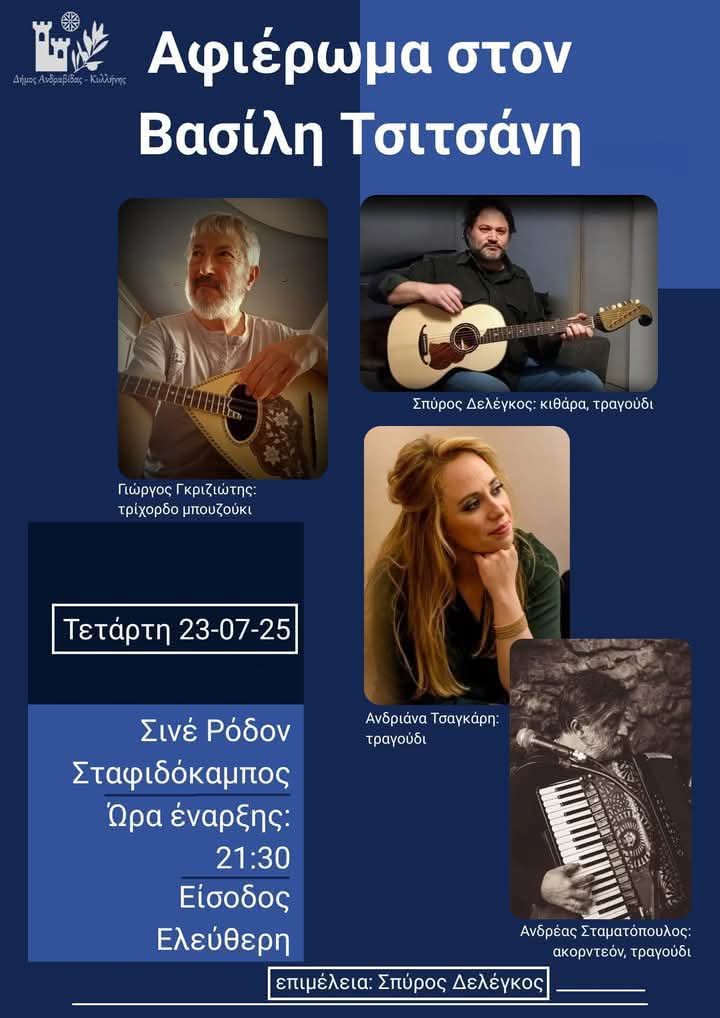 Ακόμη μια ποιοτική εκδήλωση έρχεται από το 14ο Διεθνές Φεστιβάλ Ανδραβίδας-Κυλλήνης. Αύριο, Τετάρτη 23 Ιουλίου 2025 και ώρα 21:30 θα πραγματοποιηθεί στο Σινέ Ρόδον, στον Σταφιδόκαμπο, αφιέρωμα στον Βασίλη Τσιτσάνη με μουσικό σχήμα που αποτελείται από τους: Γιώργο Γκριζιώτη, Σπύρο Δελέγκο, Ανδριάννα Τσαγκάρη και Δημήτρη Σαρρή.