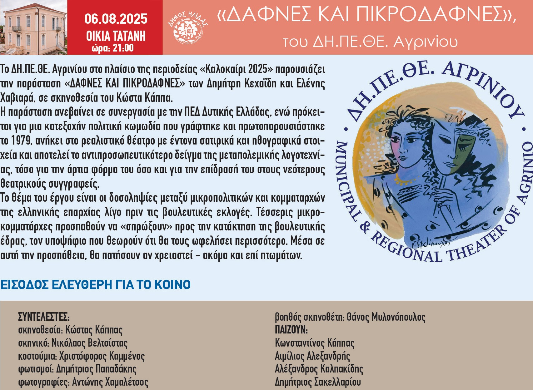 Το 35ο Φεστιβάλ Αρχαίας Ήλιδας συνεχίζεται την Τετάρτη 6 Αυγούστου 2025 και ώρα 21:00, με τη θεατρική παράσταση «Δάφνες και Πικροδάφνες» από το ΔΗ.ΠΕ.ΘΕ. Αγρινίου, η οποία θα παρουσιαστεί στην αυλή του Τατανείου, με ελεύθερη είσοδο για το κοινό.