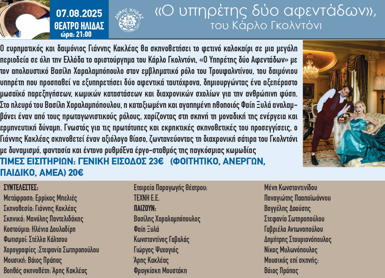 Την Πέμπτη 7 Αυγούστου 2025 και ώρα 21:00, στο πλαίσιο του 35ου Φεστιβάλ Αρχαίας Ήλιδας, παρουσιάζεται η θεατρική παράσταση «Ο υπηρέτης δύο αφεντάδων» του Κάρλο Γκολντόνι.