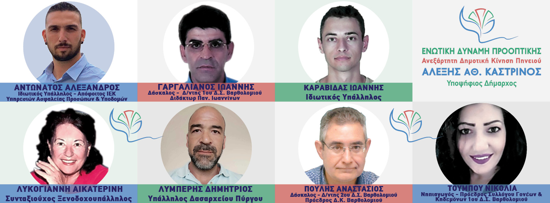 Οι υποψήφιοι σύμβουλοι της ΔΚ Βαρθολομιού εν όψει των αυτοδιοικητικών εκλογών της 8ης Οκτωβρίου, που τιμούν το ψηφοδέλτιό μας και δραστηριοποιούνται με επιτυχία σε διάφορους επαγγελματικούς τομείς, οικογενειάρχες, επιστήμονες, νέους ανθρώπους με διάθεση προσφοράς, είναι: