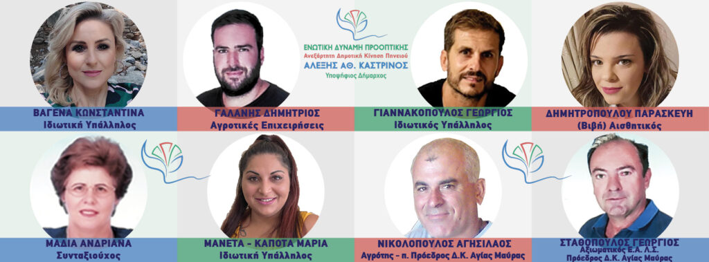 Οι υποψήφιοι σύμβουλοι των ΔΚ Αγίας Μαύρας, Δήμητρας, Καλυβίων Μυρτουντίων και Κοροίβου εν όψει των αυτοδιοικητικών εκλογών της 8ης Οκτωβρίου, που τιμούν το ψηφοδέλτιό μας και δραστηριοποιούνται με επιτυχία σε διάφορους επαγγελματικούς τομείς, οικογενειάρχες, επιστήμονες, νέους ανθρώπους με διάθεση προσφοράς, είναι: