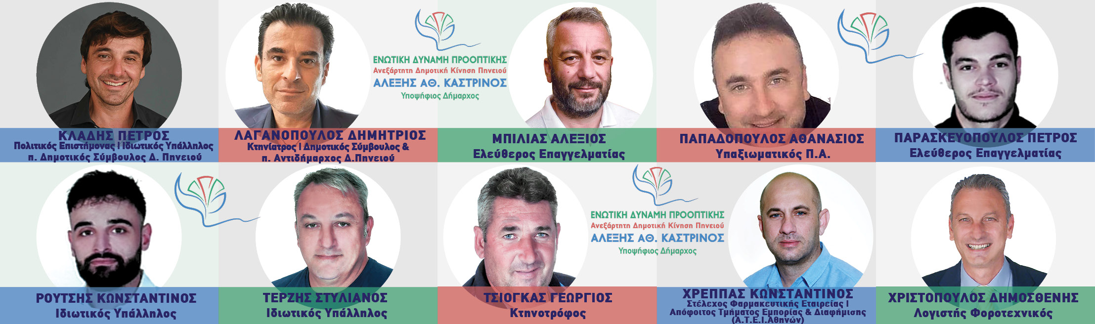 Συνεχίζουμε την παρουσίαση του ψηφοδελτίου του συνδυασμού μας ΄΄ΕΝΩΤΙΚΗ ΔΥΝΑΜΗ ΠΡΟΟΠΤΙΚΗΣ΄΄, Ανεξάρτητη Δημοτική Κίνηση Πηνειού που πλαισιώνεται από ένα μείγμα έμπειρων, νέων προσώπων αλλά κυρίως νέων ανθρώπων που μας ενώνει η αγάπη για τον τόπο μας και η διάθεση για προσφορά.
