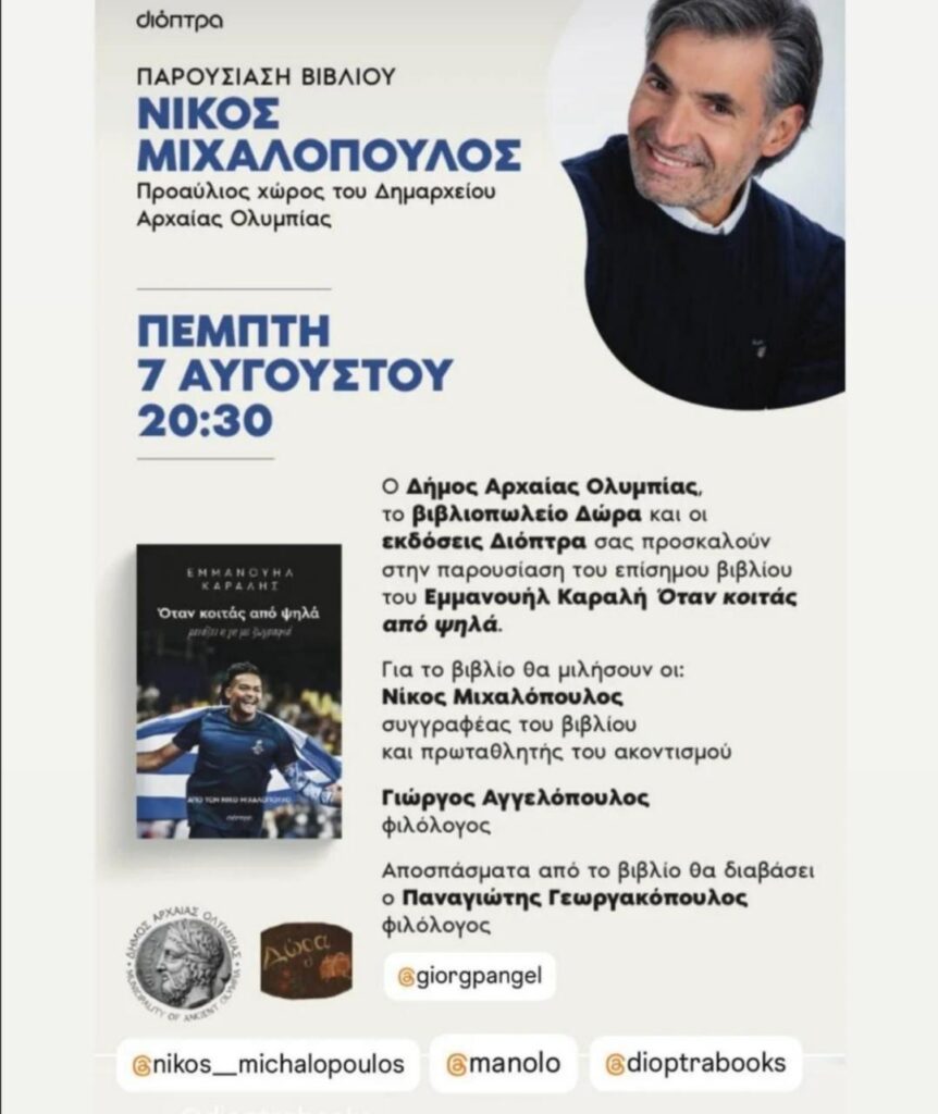 Την παρουσίαση του επίσημου βιβλίου του Εμμανουήλ Καραλή «Όταν κοιτάς από ψηλά», του συγγραφέα, Νίκου Μιχαλόπουλου, θα έχουν την ευκαιρία να παρακολουθήσουν όσοι βρεθούν απόψε, Πέμπτη 7 Αυγούστου, στον προαύλιο χώρο του Δημαρχείου Αρχαίας Ολυμπίας, στις 8.30 μ.μ.