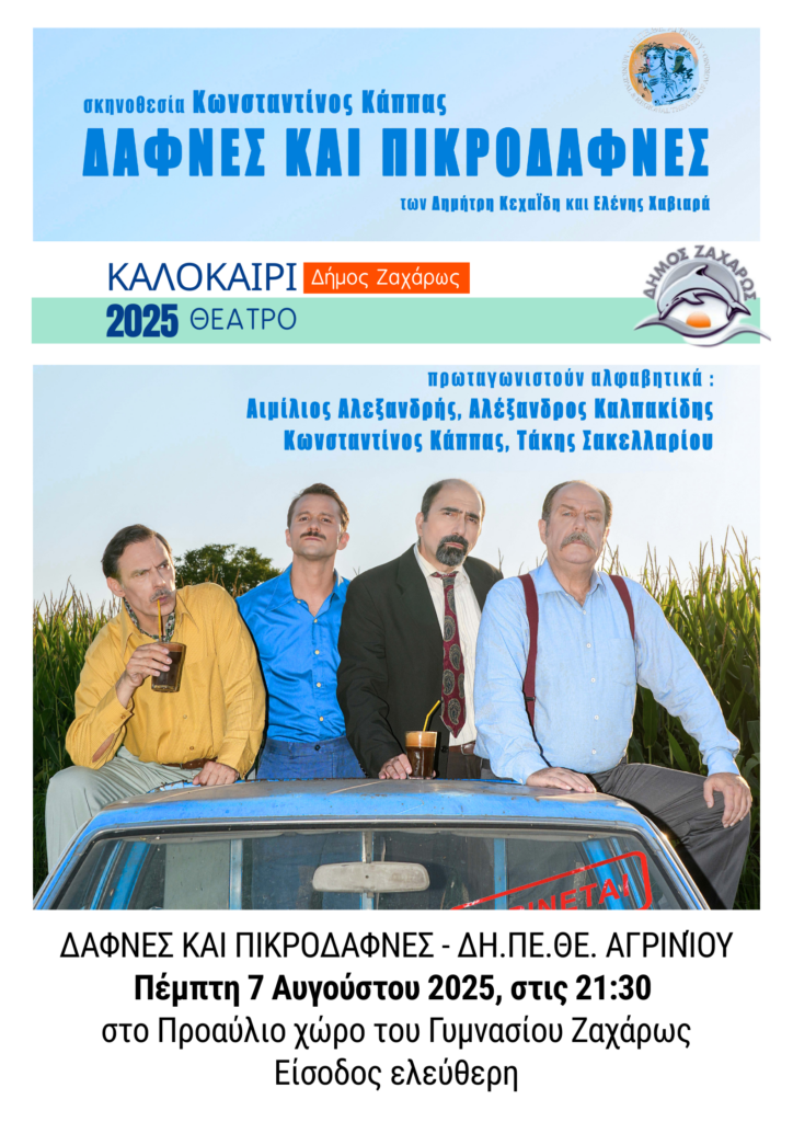 Ο Δήμος Ζαχάρως, σε συνεργασία με το Δημοτικό Περιφερειακό Θέατρο Αγρινίου, παρουσιάζει στο κοινό την εμβληματική πολιτική κωμωδία «Δάφνες και Πικροδάφνες» των Δημήτρη Κεχαΐδη και Ελένης Χαβιαρά, σε σκηνοθεσία του Κώστα Κάππα, στο πλαίσιο της καλοκαιρινής περιοδείας 2025.