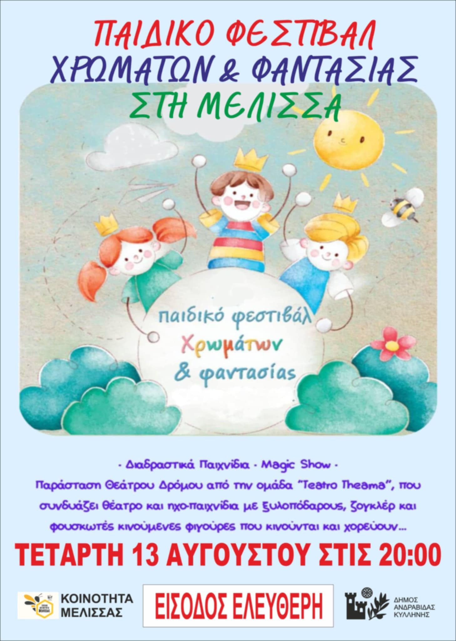 Σας προσκαλούμε στο «Παιδικό Φεστιβάλ Χρωμάτων και Φαντασίας» που θα πραγματοποιηθεί στη Μέλισσα στις 13 Αυγούστου στις 20:00.