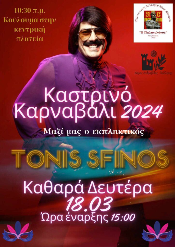 Οι καρναβαλικές εκδηλώσεις στον Δήμο κλείνουν την Καθαρά Δευτέρα, 18 Μαρτίου με το παραδοσιακό Καστρινό Καρναβάλι, στο Κάστρο. Με εκδηλώσεις για τα Κούλουμα από τις 10:00 το πρωί στην κεντρική πλατεία και την μεγάλη καρναβαλική παρέλαση να ξεκινά στις 15:00 το μεσημέρι! Παρουσιαστής του Καστρινού Καρναβαλιού ο μοναδικός Tonis Sfinos!