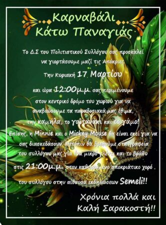 Την Κυριακή 17 Μαρτίου στις 12 το μεσημέρι θα πραγματοποιηθεί καρναβαλική παρέλαση στην Κάτω Παναγιά, ενώ στις 21:00 το βράδυ ο Πολιτιστικός και Επιμορφωτικός Σύλλογος του χωριού διοργανώνει αποκριάτικο χορό στο κέντρο Semeli.