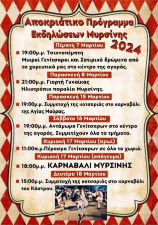 Το Σάββατο 16 Φεβρουαρίου και ώρα 19:00 θα πραγματοποιηθεί το Αντάμωμα των Γενίτσαρων στο κέντρο της αγοράς. Στις 18:00 το απόγευμα της Κυριακής 17 Μαρτίου ξεφαντώνουμε στο Καρναβάλι της Μυρσίνης!