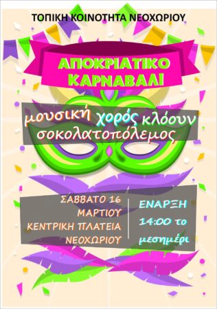 Το Σάββατο 16 Φεβρουαρίου και ώρα 14:00 το μεσημέρι θα έχουμε καρναβαλικό ξεφάντωμα στο Νεοχώρι. Μετά το πέρας της ποδαράτης θα υπάρχουν εκπλήξεις για μικρούς και μεγάλους και σοκολατοπολεμος!