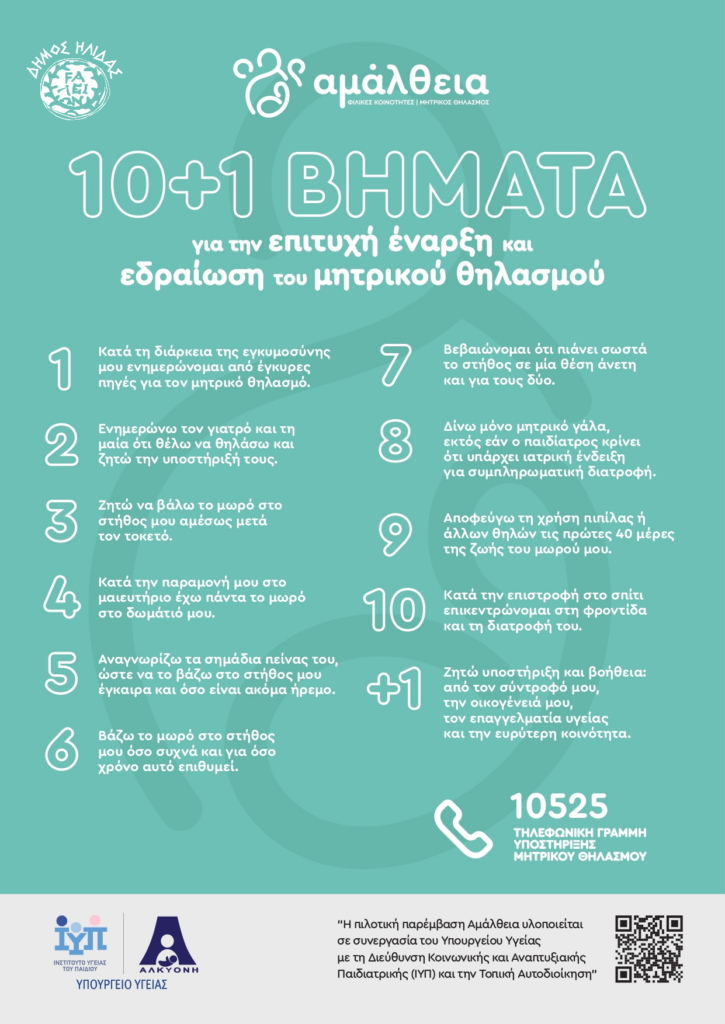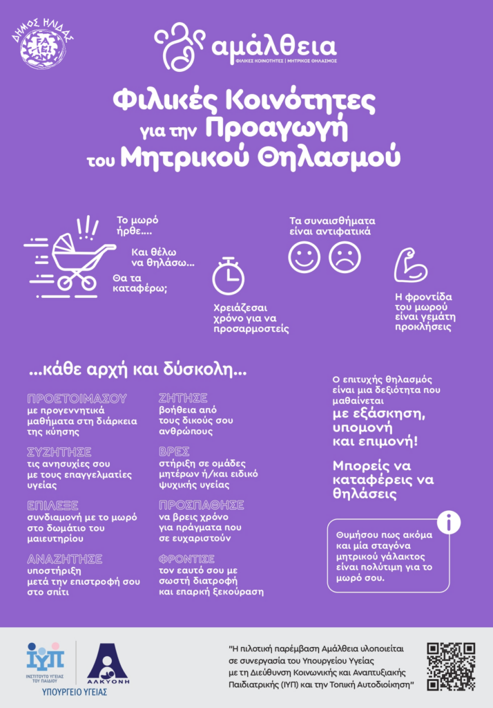 Για ακόμη μία χρονιά, ο Δήμος Ήλιδας συμμετέχει ενεργά στις πανελλήνιες δράσεις για την προαγωγή του Μητρικού Θηλασμού, ως μέλος του πιλοτικού προγράμματος υγείας «Φιλικές Κοινότητες στην Προαγωγή του Μητρικού Θηλασμού – ΑΜΑΛΘΕΙΑ».