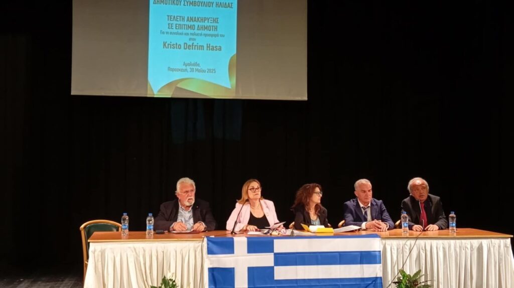 Σε μια ιδιαίτερα συγκινητική τελετή που πραγματοποιήθηκε στον Πολυχώρο Πολιτισμού Αμαλιάδας, ο Δήμος Ήλιδας ανακήρυξε τον ζωγράφο Kristo Defrim Hasa Επίτιμο Δημότη, σε ειδική συνεδρίαση του Δημοτικού Συμβουλίου αφιερωμένη αποκλειστικά στο έργο και την προσφορά του.