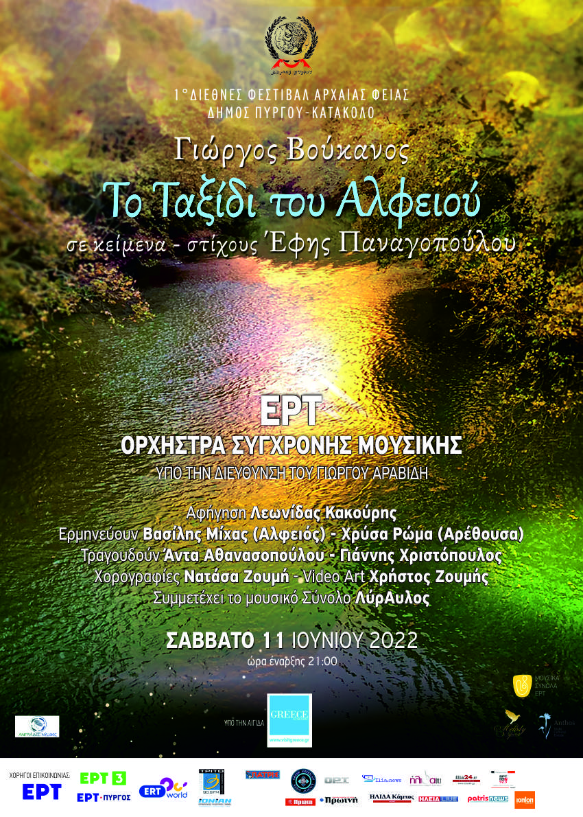 Την επόμενη μέρα Σάββατο 11 Ιουνίου 2022 στο Κατάκολο και ώρα 21.00, η Ορχήστρα Σύγχρονης Μουσικής της ΕΡΤ υπό τη διεύθυνση του Γιώργου Αραβίδη παρουσιάζει σε 1η εκτέλεση το μουσικό έργο του Γιώργου Βούκανου “Το Ταξίδι του Αλφειού” σε κείμενα – στίχους Έφης Παναγοπούλου, με τη συμμετοχή του μουσικού συνόλου Λύραυλος.