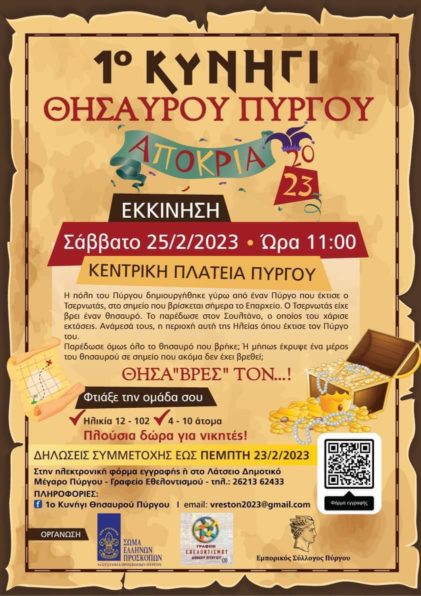 Ο Δήμος Πύργου και το Γραφείο Εθελοντισμού, στο πλαίσιο των καρναβαλικών εκδηλώσεων διοργανώνουν για πρώτη φορά το 1ο Κυνήγι Θησαυρού Πύργου, το Σάββατο 25 Φεβρουαρίου στην Κεντρική πλατεία της πόλης και ώρα 11.00 π.μ.