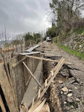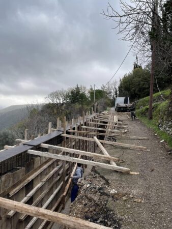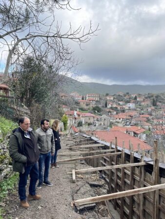 Κατά τη διάρκεια της επίσκεψης πραγματοποιήθηκε ενημέρωση για την πρόοδο των εργασιών. Ήδη κατασκευάζεται τοίχος αντιστήριξης, μήκους περίπου 30 μ. και ύψους περίπου 3 μ., για την αποφυγή περαιτέρω υποχώρησης του εδάφους στο σημείο. Σε συνδυασμό με τη διαπλάτυνση του άλλοτε στενού δρόμου, θα διευκολύνεται σε μεγάλο βαθμό η διέλευση των οχημάτων. Οι εν λόγω παρεμβάσεις εντάσσονται στο έργο «Αποκαταστάσεις Ζημιών από τις Θεομηνίες του Νοεμβρίου του 2019» και αναμένεται να ολοκληρωθούν το προσεχές διάστημα.
