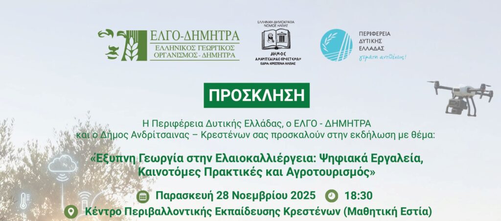 Εκδήλωση με θέμα «έξυπνη Γεωργία στην Ελαιοκαλλιέργεια: Ψηφιακά Εργαλεία, καινοτόμες Πρακτικές και Αγροτουρισμός», θα γίνει την Παρασκευή 28 Νοεμβρίου και ώρα 18:30 στο Κέντρο Περιβαλλοντικής Εκπαίδευσης Κρεστένων (πρ. Μαθητική Εστία).