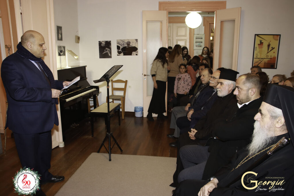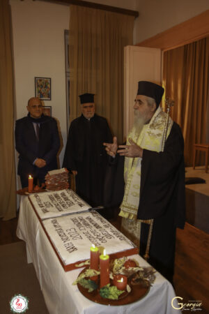 Στη συνέχεια ο Σεβασμιότατος Μητροπολίτης Ηλείας & Ωλένης κ.κ. Αθανάσιος ευλόγησε την πίτα με τους παρευρισκόμενους ιερείς, Πρωτοπρεσβύτερους π. Βασίλειο Λαγκαδινό, προϊστάμενο του Ι.Ν. Αγ.Κυριακής, π. Νικόλαο Κατσιδήμα, προϊστάμενο Ι.Ν. Αγ. Σπυρίδωνος, π. Γεώργιο Αναγνωστόπουλο, εφημέριο Ι.Ν. Αγ. Νικολάου και καθηγητή Μουσικού Σχολείου Βαρθολομιού, με τη συμμετοχή βυζαντινού χορού από σπουδαστές και απόφοιτους του Ωδείου, υπό την ευθύνη του καθηγητή βυζαντινής μουσικής του Ωδείου και πρωτοψάλτου Νίκου Παπαδημητρίου. Ο Σεβασμιότατος εξήρε με τον λόγο του το σημαντικό έργο του Ωδείου, λέγοντας χαρακτηριστικά ότι αυτό το Ωδείο είναι ένας ναός του πολιτισμού. Ανέφερε την ιστορία με τον άγιο Ιωάννη Κουκουζέλη, συνδυάζοντάς την με το ρόλο της μουσικής στη ζωή του ανθρώπου, τονίζοντας ότι το Ωδείο δίνει πνευματική τροφή και προφυλάσσει τα παιδιά και τους νέους από διάφορες αρνητικές επιρροές.
