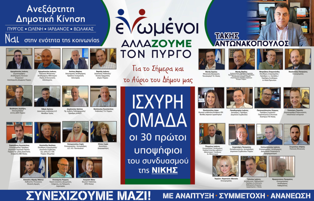 Ανακοινώθηκαν οι πρώτοι τριάντα υποψήφιοι του συνδυασμού “ΕΝΩΜΕΝΟΙ ΑΛΛΑΖΟΥΜΕ ΤΟΝ ΠΥΡΓΟ” του νυν Δημάρχου Πύργου κ. Παναγιώτη Αντωνακόπουλου.