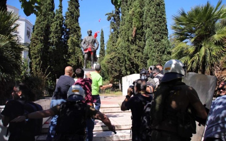 Συγκεκριμένα, κάποια άτομα έριξαν μπογιές στο άγαλμα του Τρούμαν, ενώ ακολούθησαν μικροσυμπλοκές μεταξύ μελών του ΠΑΜΕ και αστυνομικών, με τους δεύτερους να προχωρούν σε χρήση χημικών.