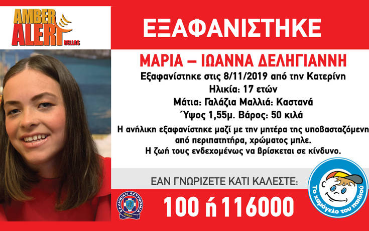 Πιο συγκεκριμένα, σύμφωνα με την ανακοίνωση από το Χαμόγελο του Παιδιού, στις 8 Νοεμβρίου και ώρα 14:00, εξαφανίστηκε από την Κατερίνη, η Μαρία – Ιωάννα Δεληγιάννη, 17 ετών.
