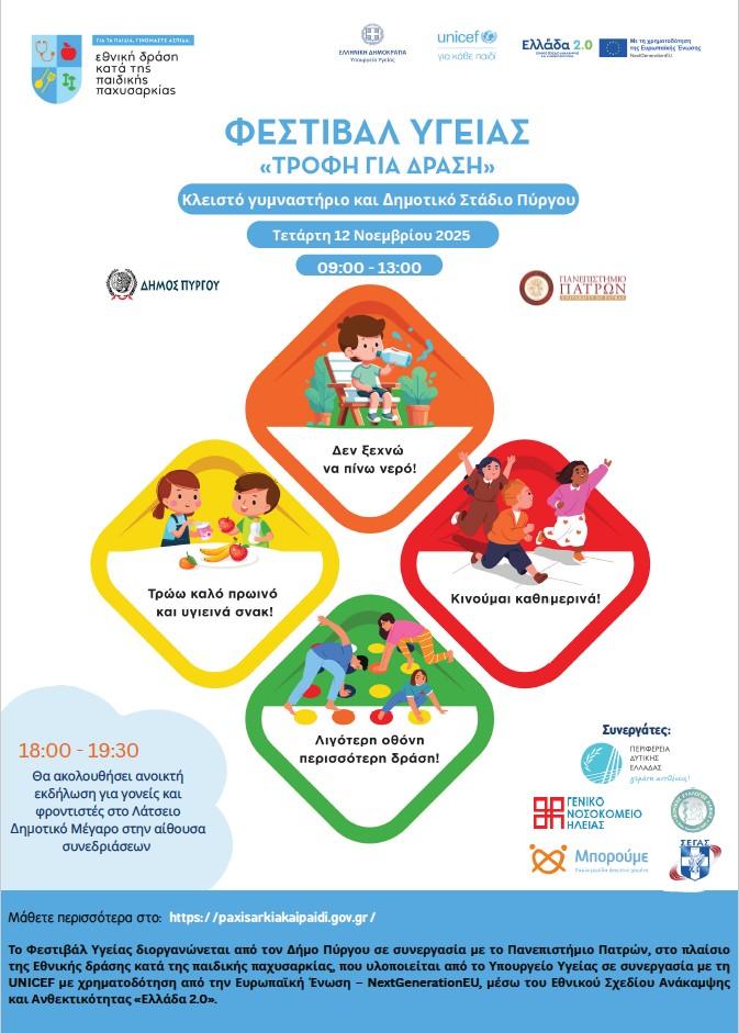 Ο Δήμος Πύργου, στο πλαίσιο των δράσεων προαγωγής της δημόσιας υγείας και της ευαισθητοποίησης της τοπικής κοινωνίας, διοργανώνει την Τετάρτη 12 Νοεμβρίου 2025 το Φεστιβάλ Υγείας με θέμα «Τροφή για Δράση».