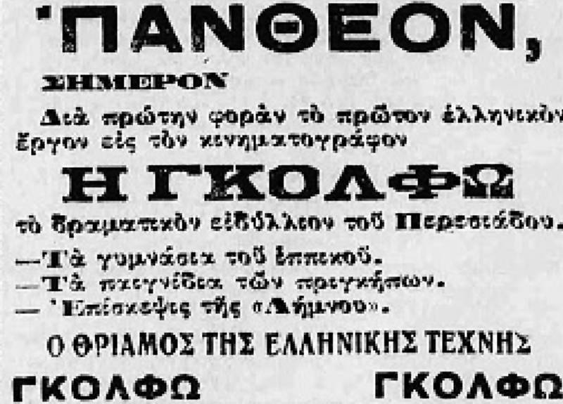 Τι να συμβαίνη; Απλούστατα Εταιρεία κινηματογραφικών ταινιών εμάζεψε όλους σχεδόν τους ηθοποιούς, οι οποίοι δεν ήρχισαν ακόμη να εργάζωνται και κινηματογραφεί το ωραίον λαϊκόν δράμα του κ. Περεσιάδη «Η Γκόλφω». Αι κουίνται αντικατεστάθησαν διά φόντου φυσικού και αι σκηναί του δράματος εκτυλίσσονται σε αληθινές ραχούλες και η λιγερές πηγαίνουν σε αληθινή βρύσι να πάρουν νερό. Η ιδέα είνε ωραιοτάτη και αν η εκτέλεσις είνε καλή, η Γκόλφω θα είνε μία από τας ωραιοτέρας και πρωτοτυποτέρας ταινίας του κινηματογράφου».
