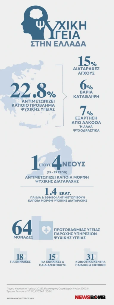 Η ψυχική υγεία στην Ελλάδα βρίσκεται αντιμέτωπη με μια αυξανόμενη κρίση, που πλέον δεν μπορεί να αγνοηθεί. Τα πιο πρόσφατα στοιχεία δείχνουν ότι περίπου 22,8% του πληθυσμού αντιμετωπίζει κάποια μορφή ψυχικής διαταραχής, ενώ τα ποσοστά άγχους και κατάθλιψης συνεχώς αυξάνονται.