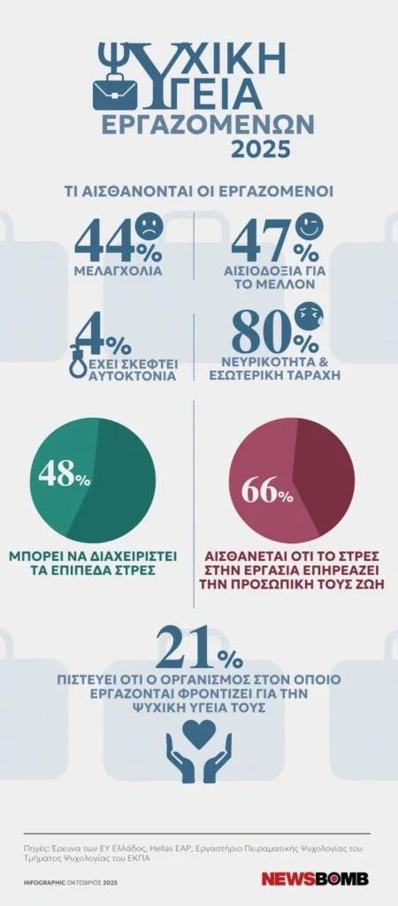Αλλά και στους χώρους εργασίας, τα στοιχεία είναι δραματικά. Πρόσφατη έρευνα με στοιχεία του 2025 (ΕΥ Ελλάδος, Hellas EAP, ΕΚΠΑ) καταγράφει ότι 44% των εργαζομένων αισθάνεται μελαγχολία, 47% απαισιοδοξία για το μέλλον, ενώ το 4% έχει σκεφτεί ακόμα και την αυτοκτονία.