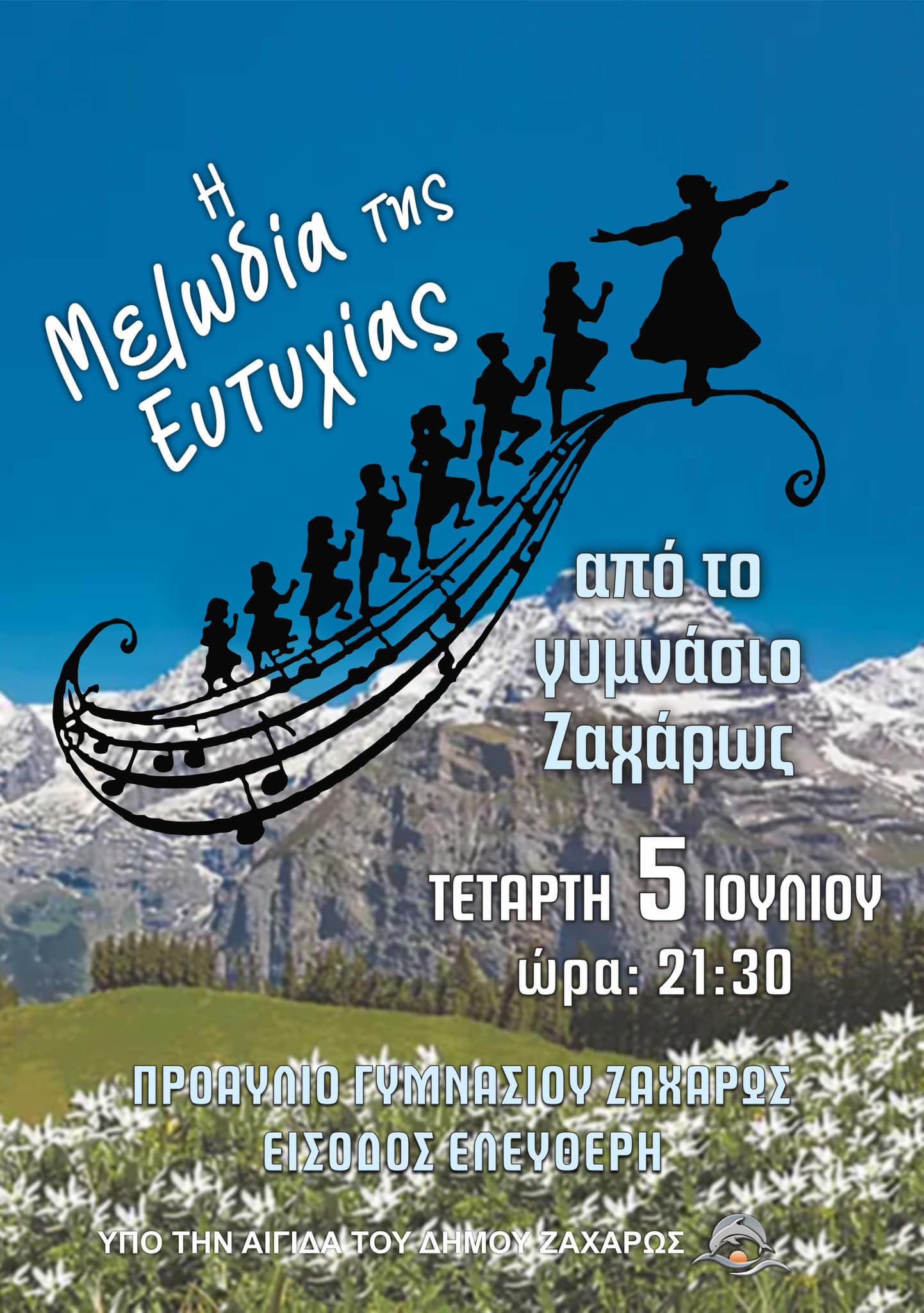 Τη θεατρική παράσταση «Η Μελωδία της Ευτυχίας» θα παρουσιάσουν μαθητές και μαθήτριες του Γυμνασίου Ζαχάρως σήμερα Τετάρτη 5 Ιουλίου και ώρα 21:30 στον προαύλιο χώρο του σχολείου. Η παράσταση είναι υπό την αιγίδα του Δήμου Ζαχάρως, ο οποίος προσκαλεί όλους τους δημότες να παρακολουθήσουν τη δουλειά και το ταλέντο των μαθητών. Η είσοδος είναι ελεύθερη.