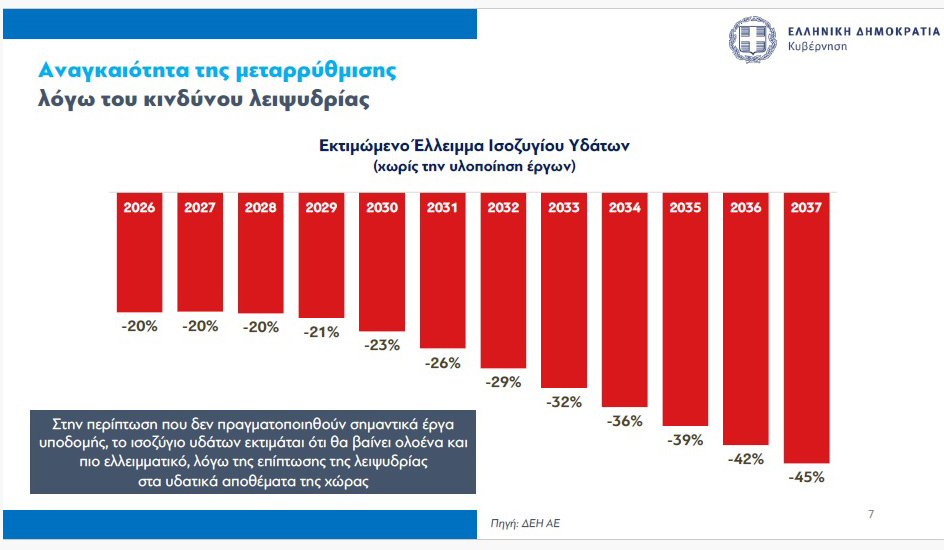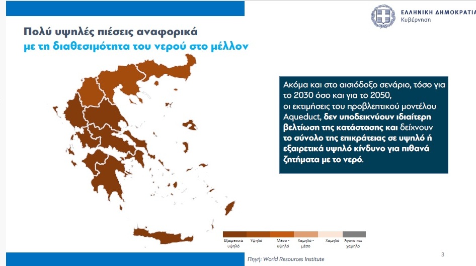 Με βάση τα στοιχεία, η χώρα μας κατατάσσεται στην 19η θέση παγκοσμίως ως προς τον κίνδυνο λειψυδρίας. Η στάθμη των φραγμάτων είναι σε ιστορικά χαμηλά επίπεδα, ενώ ενδεικτικό είναι πως τα αποθέματα στην Αττική έχουν μειωθεί πάνω από 50% σε σχέση με το 2022.