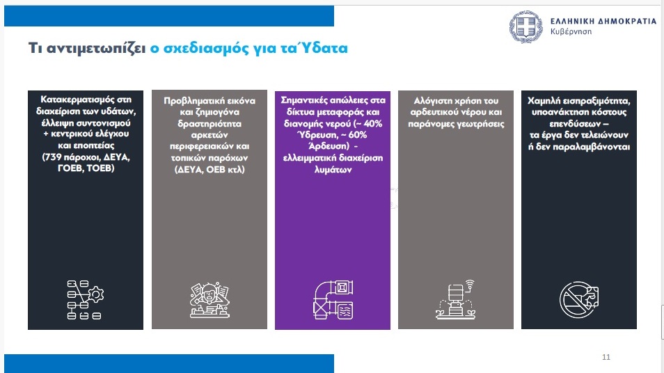 Υπό τα δεδομένα αυτά, αποφασίστηκε ένας ολιστικός τρόπος αντιμετώπισης του ζητήματος απέναντι στον κατακερματισμό, μεταξύ διαφορετικών φορέων, που υπάρχει σήμερα. Η κυβέρνηση πρόκειται να προχωρήσει σε ριζική αλλαγή του μοντέλου διαχείρισης των υδάτων στη χώρα, σε ένα πιο λειτουργικό σύστημα, με μεγαλύτερη αποδοτικότητα και περισσότερες επενδύσεις. Σ’ αυτή την προσπάθεια θα αξιοποιηθούν οι νέες τεχνολογίες, καθώς και συμπληρωματικοί τρόποι παραγωγής νερού, όπως η αφαλάτωση.