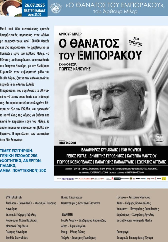 Μετά από δύο συνεχόμενες χρονιές θριαμβευτικής παρουσίας στην Αθήνα, με περισσότερους από 150.000 θεατές και 350 παραστάσεις, το βραβευμένο με Πούλιτζερ έργο του Μίλλερ παρουσιάζεται στο Θέατρο της Αρχαίας Ήλιδας, σε σκηνοθεσία του Γιώργου Νανούρη, με τον Βλαδίμηρο Κυριακίδη στον εμβληματικό ρόλο του Γουίλι Λόμαν.