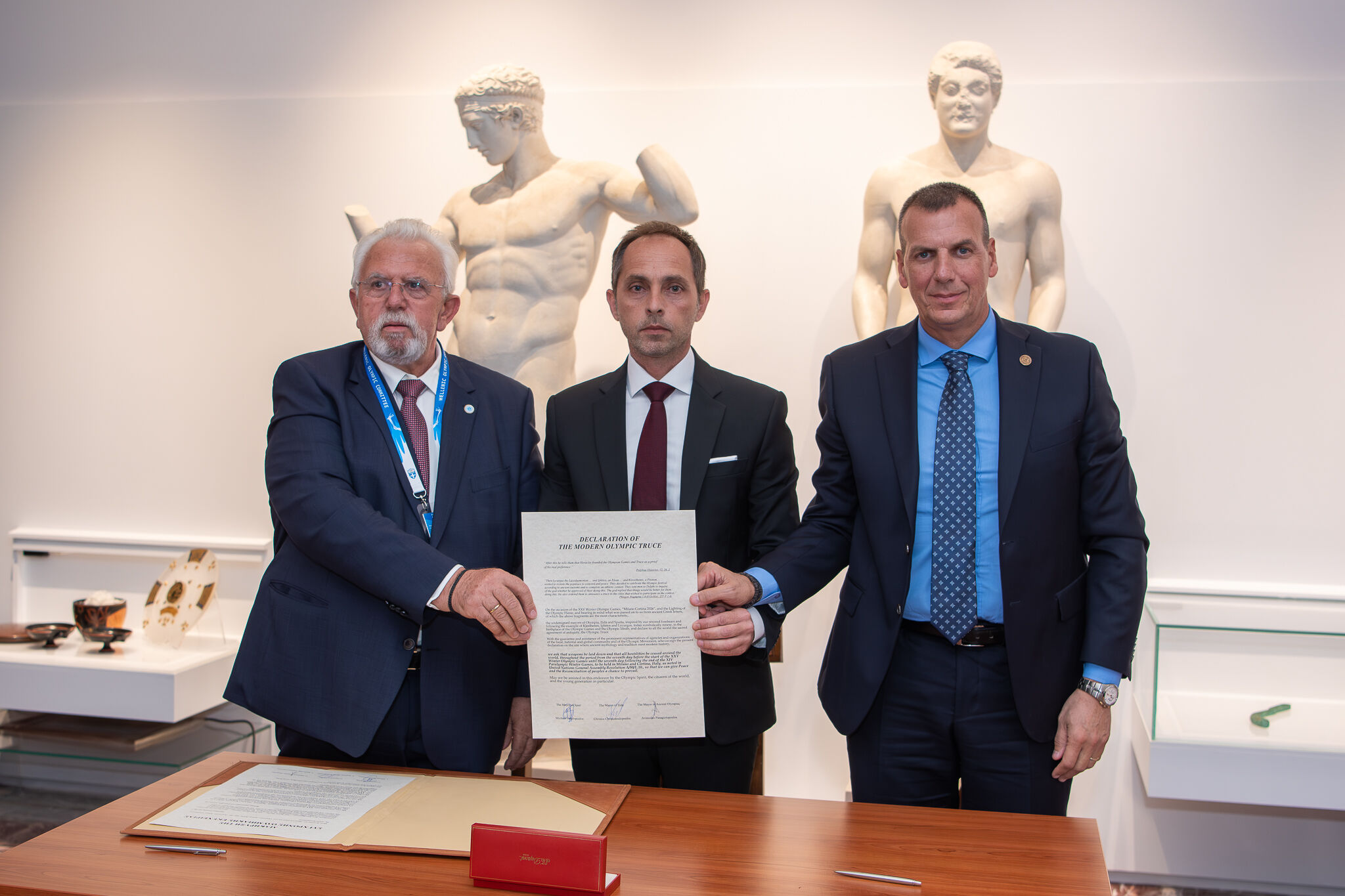 Την Διακήρυξη υπέγραψαν, επίσης, η Πρόεδρος της Διεθνούς Ολυμπιακής Επιτροπής, Coventry Kirsty, ο Πρόεδρος του Διεθνούς Κέντρου Ολυμπιακής Εκεχειρίας, Γεώργιος Παπανδρέου, ο Πρόεδρος της Ελληνικής Ολυμπιακής Επιτροπής, Ισίδωρος Κούβελος, το μέλος της Διεθνούς Ολυμπιακής Επιτροπής, Σπύρος Καπράλος, το Μέλος της Εκτελεστικής Επιτροπής της ΔΟΕ και Πρόεδρος της Συντονιστικής Επιτροπής της ΔΟΕ – Μιλάνο Κορτίνα 2026, Kloster Kristin, ο Υπουργός Αθλητισμού και Ολυμπιακών Αγώνων Ιταλίας, Abodi Andrea, ο Πρόεδρος της Οργανωτικής Επιτροπής “Milano Cortina 2026”, Malagò Giovanni, ο Πρόεδρος της Ολυμπιακής Επιτροπής της Ιταλίας, Buonfiglio Luciano, ο Δήμαρχος της Κορτίνα, Lorenzi Gianluca, ο Πρέσβης της Ιταλίας στην Ελλάδα, CuculiPaolo, ο Πρέσβης της Γεωργίας στην Ελλάδα, Levan Beridze, ο Πρέσβης του Καζακστάν στην Ελλάδα, SultangozhinTimur, ο Εκπρόσωπος της Κυβέρνησης Αναπληρωτής Υπουργός Παιδείας Θρησκευμάτων και Αθλητισμού, Γιάννης Βρούτσης, ο Περιφερειάρχης Δυτικής Ελλάδας, ΝεκτάριοςΦαρμάκης, ο Πρόεδρος της Διεθνούς Ολυμπιακής Ακαδημίας, Χαρίλαος Τσολάκης, η Πρόεδρος συμμετασχόντων σε Ολυμπιακούς Αγώνες, Σταυρούλα Κοζομπόλη, το Μέλος του Εκτελεστικού Συμβουλίου της ΔΟΕ – Πρόεδρος της Επιτροπής Αθλητών της ΔΟΕ, Terho Emma, ο Πρόεδρος της Εθνικής Ολυμπιακής Επιτροπής της Γεωργίας, Leri Khabelov, ο Ολυμπιονίκης, Ταμπάκος Δημοσθένης, το Μέλος Εκτελεστικού Συμβουλίου της ΔΟΕ, Ivo Ferriani, το Μέλος της ΔΟΕ, Federica Pellegrini, το Επίτιμο Μέλος της ΔΟΕ, Manuela Di Centa, το Επίτιμο μέλος της ΔΟΕ, Francesco RicciBitti, ο Πρίγκιπας Αλ Σαούντ Φαχάντ, ο Διευθυντής του Διεθνούς Κέντρου Ολυμπιακής Εκεχειρίας Δρ. ΚωνσταντίνοςΦίλης, η Καλλιτεχνική Διευθύντρια και Χορογράφος των Τελετών Αφής/Παράδοσης, ΆρτεμιςΙγνατίου και η Ηθοποιός και Πρωθιέρεια, Μαίρη Μηνά.
