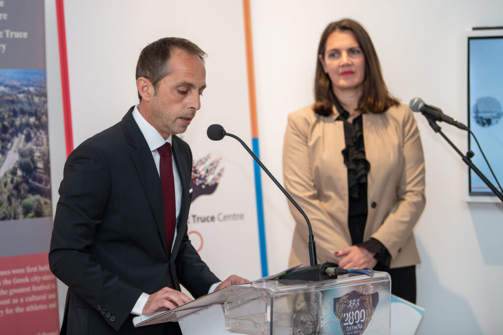 «Υπάρχουν ορισμένες πράξεις που, αν και συμβολικές, μπορούν να αποτελέσουν μια ουσιαστική επικαιροποίηση διαχρονικών πανανθρώπινων Αξιών, όπως αυτές του “Ολυμπισμού” και της “Εκεχειρίας”. Έτσι και η σημερινή συνυπογραφή της Εκεχειρίας του 21ου αιώνα, αποτελεί μια νέα πράξη μεταξύ των πόλεων που συνυπέγραψαν την πρώτη Ολυμπιακή Εκεχειρία, περίπου 2.800 χρόνια πριν. Αποτελεί μια πράξη πρωτίστως πολιτική, που στις μέρες μας -με τα όσα συμβαίνουν γύρω μας- θα έπρεπε να έχει πιο ουσιαστικό χαρακτήρα.. Ήταν η πρώτη συνθήκη, που απέδειξε ότι πολλοί άνθρωποι μπορούν να συναγωνίζονται και όχι να ανταγωνίζονται. Σήμερα, η Ολυμπιακή Φλόγα μεταφέρει το παγκόσμιο αίτημα της Εκεχειρίας, το οποίο είναι πιο επίκαιρο από ποτέ. Κάθε δάδα που ανάβει και κάθε λαμπαδηδρόμος, αποτελούν τους αγγελιοφόρους της ειρήνης.