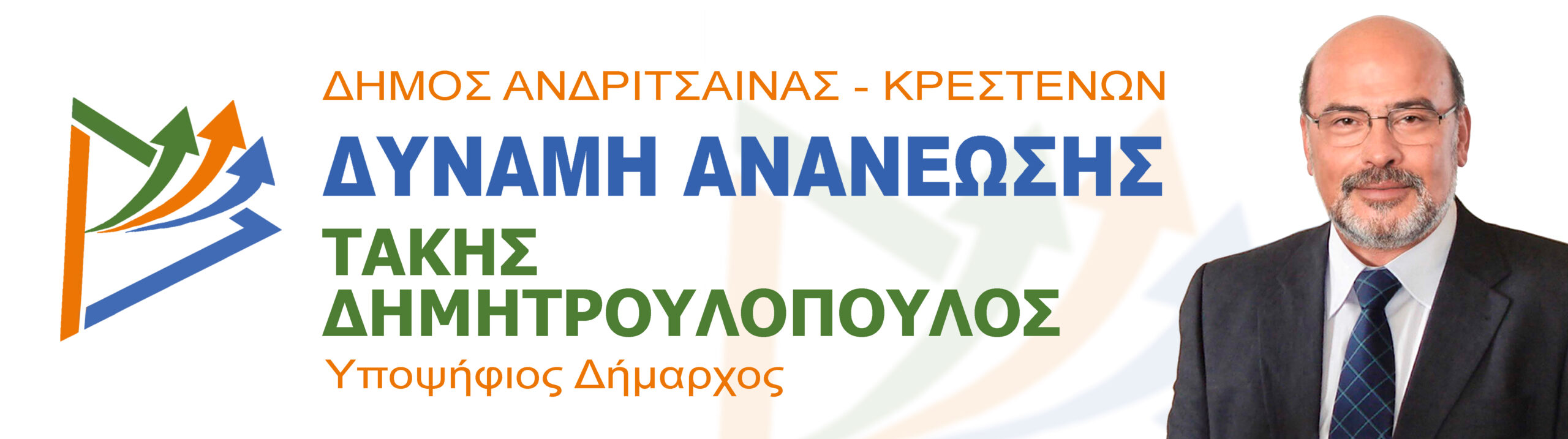 Το νέο λογότυπο της παράταξης «ΔΥΝΑΜΗ ΑΝΑΝΕΩΣΗΣ» έχει μια σύγχρονη και μοντέρνα απλοποιημένη μορφή. Το έμβλημα της παράταξής μας είναι ένα ισόπλευρο τρίγωνο που συμβολίζει την ισότητα και το ενωτικό πνεύμα στις τρείς Δημοτικές Ενότητες, ΑΛΙΦΕΙΡΑΣ, ΑΝΔΡΙΤΣΑΙΝΑΣ & ΣΚΙΛΛΟΥΝΤΟΣ, που αποτελούν το Δήμο Ανδρίτσαινας-Κρεστένων. Μέσα από το τρίγωνο πηγάζουν τρία βέλη με ανοδική φορά, τα οποία συμβολίζουν την ανάγκη για ανανέωση, για ανάπτυξη και για πρόοδο του Δήμου μας. Οι έντονες γραμματοσειρές τονίζουν τη δυναμική και τη βαρύτητα της παράταξης, ενώ η ποικιλότητα των χρωμάτων δηλώνει την πολυσυλλεκτικότητά της.