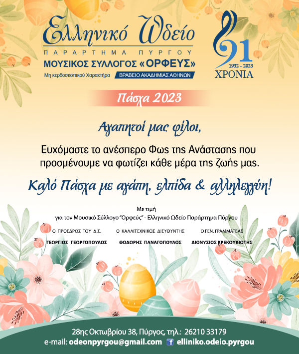 Πασχαλινό μήνυμα Ωδείου Πύργου “ΟΡΦΕΥΣ”