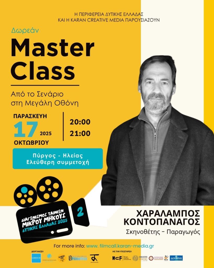 Τονίζεται ότι το εργαστήριο εντάσσεται στις παράλληλες δράσεις του Διαγωνισμού Ταινιών Μικρού Μήκους Δυτικής Ελλάδας 2025, οι οποίες πραγματοποιούνται με στόχο να προσφέρουν στους νέους δημιουργούς και μαθητές της Περιφέρειας ευκαιρίες εκπαίδευσης, έμπνευσης και ενεργούς συμμετοχής.
