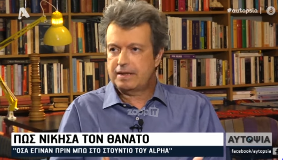 Ο γνωστός συγγραφέας και πρώην Βουλευτής σε συνέντευξη του στην Αυτοψία και τον Αντώνη Σρόιτερ περιέγραψε τον δυνατό πόνο που ένιωσε σαν μαχαιριά, όλες τις δραματικές στιγμές που έζησε πεσμένος στο έδαφος του στούντιο, τις σκέψεις που πέρασαν από το μυαλό του νομίζοντας πως πεθαίνει, τις υπεράνθρωπες προσπάθειες που έκαναν οι γιατροί του Ιπποκράτειου να τον κρατήσουν στην ζωή.