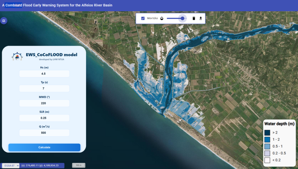 Στο πλαίσιο του EWS_CoCoFlood, που χρηματοδοτείται από το Πράσινο Ταμείο, αναπτύχθηκε ένα καινοτόμο σύστημα έγκαιρης πρόγνωσης συνδυαστικών παράκτιων πλημμυρικών γεγονότων με χρήση Τεχνητής Νοημοσύνης το οποίο εφαρμόστηκε πιλοτικά στην παράκτια ζώνη του Δήμου Πύργου, εκατέρωθεν της εκβολής του ποταμού Αλφειού.