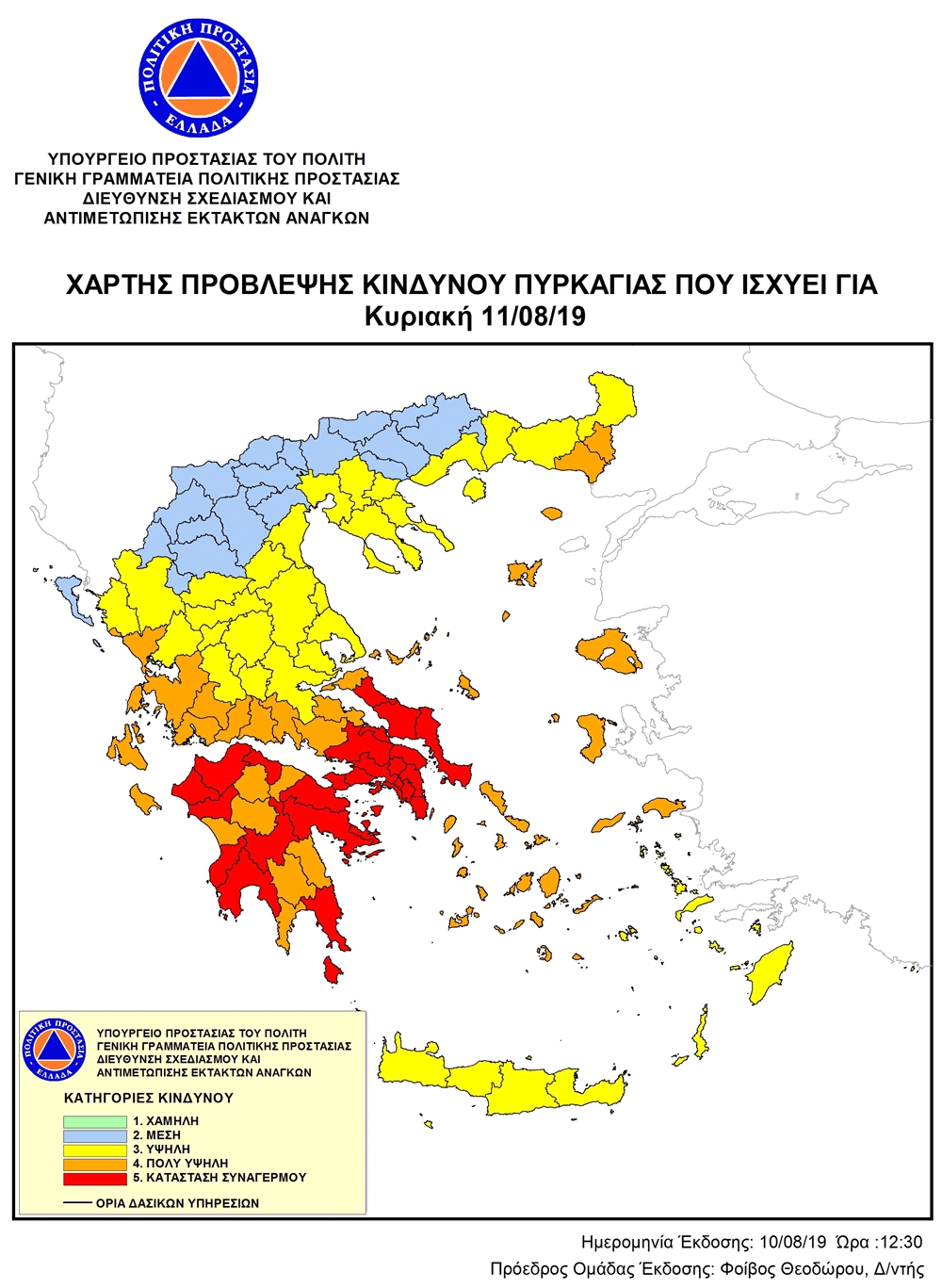 Σύμφωνα με πρόβλεψη της Γενικής Γραμματείας Πολιτικής Προστασίας, την Κυριακή 11 Αυγούστου 2019, η πρόβλεψη του κινδύνου πυρκαγιών εκτιμάται Ακραία (Κατηγορία Κινδύνου 5 – Κατάσταση Συναγερμού) για τις Περιφερειακές Ενότητες Αχαΐας και Ηλείας, ενώ η Περιφερειακή Ενότητα Αιτωλοακαρνανίας θα βρίσκεται στην κατηγορία κινδύνου 4 (πολύ υψηλή), όπως φαίνεται στον επισυναπτόμενο ημερήσιο Χάρτη Πρόβλεψης Κινδύνου Πυρκαγιάς.
