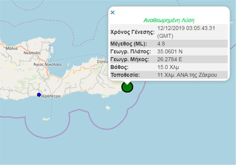 Σεισμική δόνηση 4,8 βαθμών της κλίμακας Ρίχτερ σημειώθηκε στις 05:05 στον θαλάσσιο χώρο 12 χιλιόμετρα ανατολικά – νοτιοανατολικά της Ζάκρου (ανατολική Κρήτη), γνωστοποίησε με ανακοίνωση που διένειμε στα μέσα ενημέρωσης μέσω ηλεκτρονικού ταχυδρομείου το Γεωδυναμικό Ινστιτούτο του Εθνικού Αστεροσκοπείου Αθηνών, εκ μέρους των τεσσάρων φορέων συγκρότησης του Εθνικού Σεισμολογικού Δικτύου.