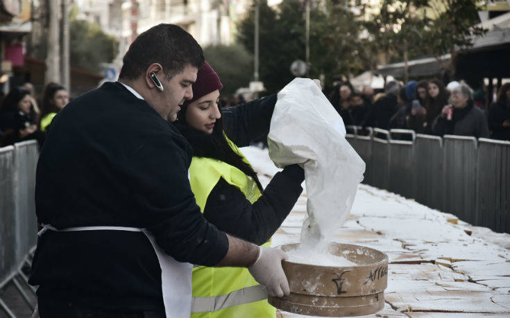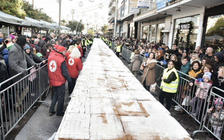 Η Συντεχνία Αρτοποιών Αθηνών, Προαστίων & Περιχώρων και ο Δήμος Περιστερίου σε μια μοναδική γιορτή δημιούργησαν και φέτος τη μεγαλύτερη βασιλόπιτα, με περισσότερα από 35.000 κομμάτια και 200 φλουριά που αντιστοιχούν σε δώρα.