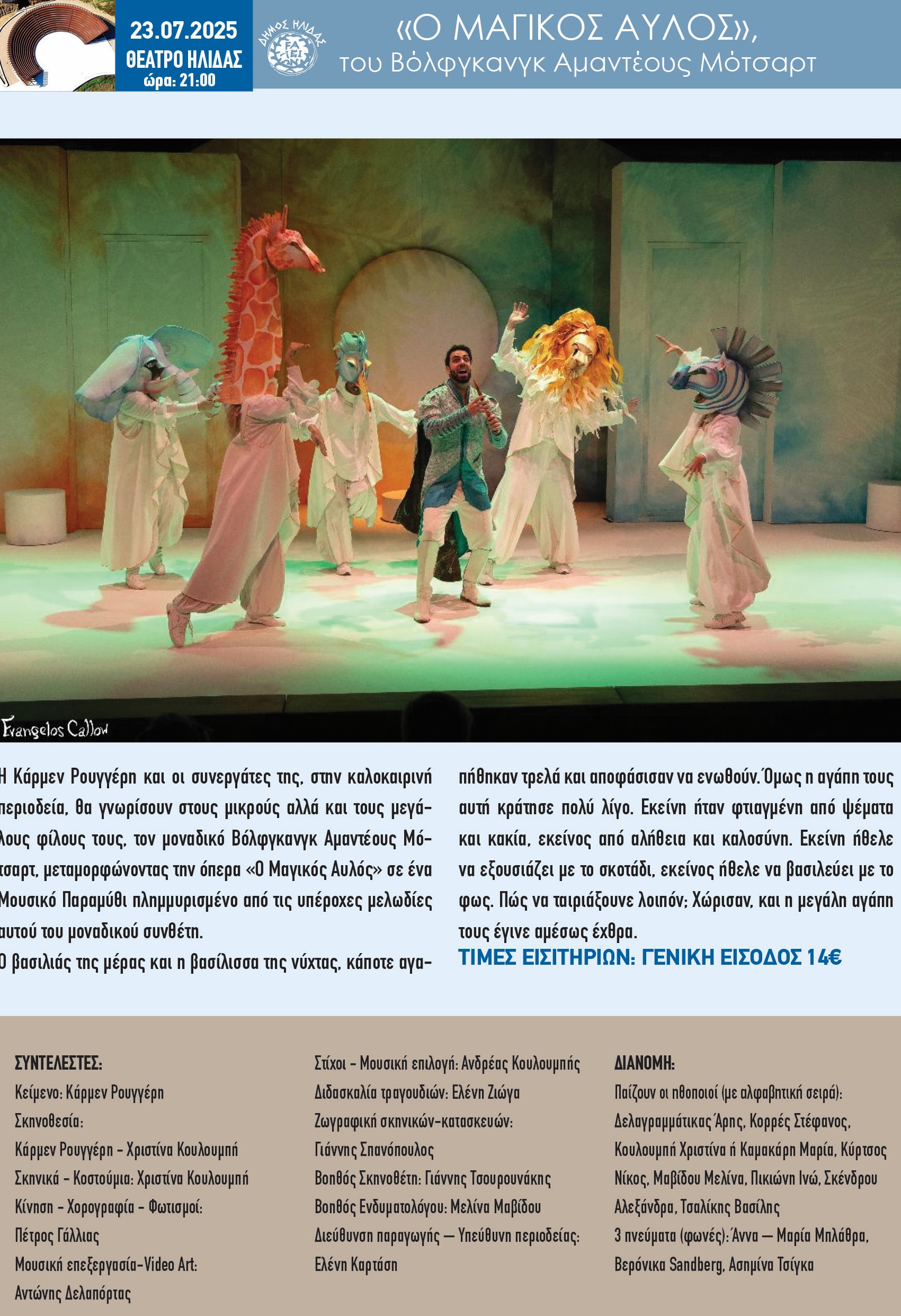 Το Θέατρο της Αρχαίας Ήλιδας υποδέχεται για ακόμη μία χρονιά την Κάρμεν Ρουγγέρη, η οποία παρουσιάζει την παιδική παράσταση «Ο Μαγικός Αυλός» του Βόλφγκανγκ Αμαντέους Μότσαρτ στο πλαίσιο του 35ου Διεθνούς Φεστιβάλ Αρχαίας Ήλιδας.