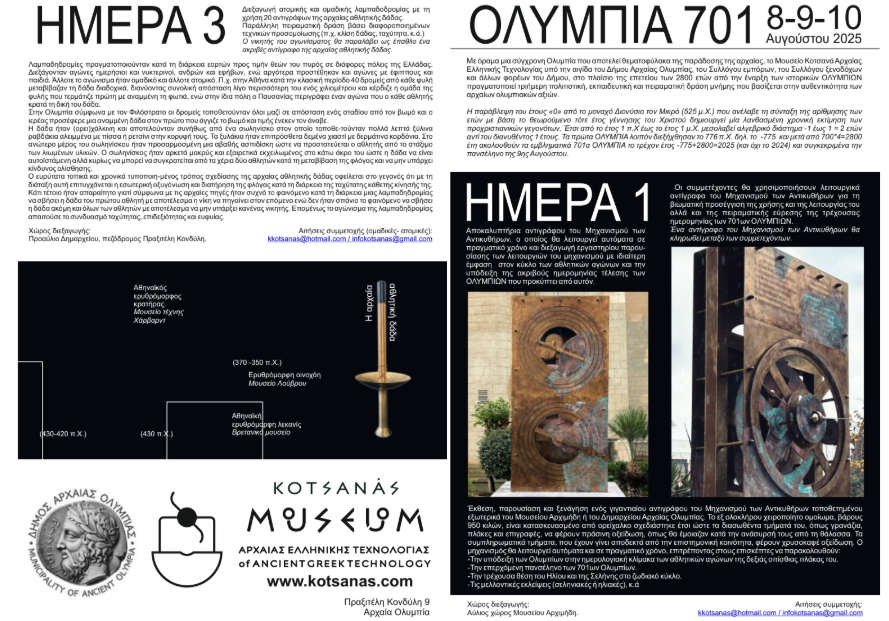 Με αφορμή την ιστορική επέτειο των 2800 ετών από την έναρξη των Ολυμπίων (776 π.Χ.), το Μουσείο Κοτσανά Αρχαίας Ελληνικής Τεχνολογίας, υπό την αιγίδα του Δήμου Αρχαίας Ολυμπίας και με τη συνεργασία τοπικών φορέων, διοργανώνει τριήμερη πολιτιστική, εκπαιδευτική και πειραματική δράση, βασισμένη στην αυθεντικότητα των Ολυμπιακών πεποιθήσεων και με γνώμονα ότι η σύγχρονη Ολυμπία πρέπει να αποτελεί θεματοφύλακα της παράδοσης της αρχαίας.