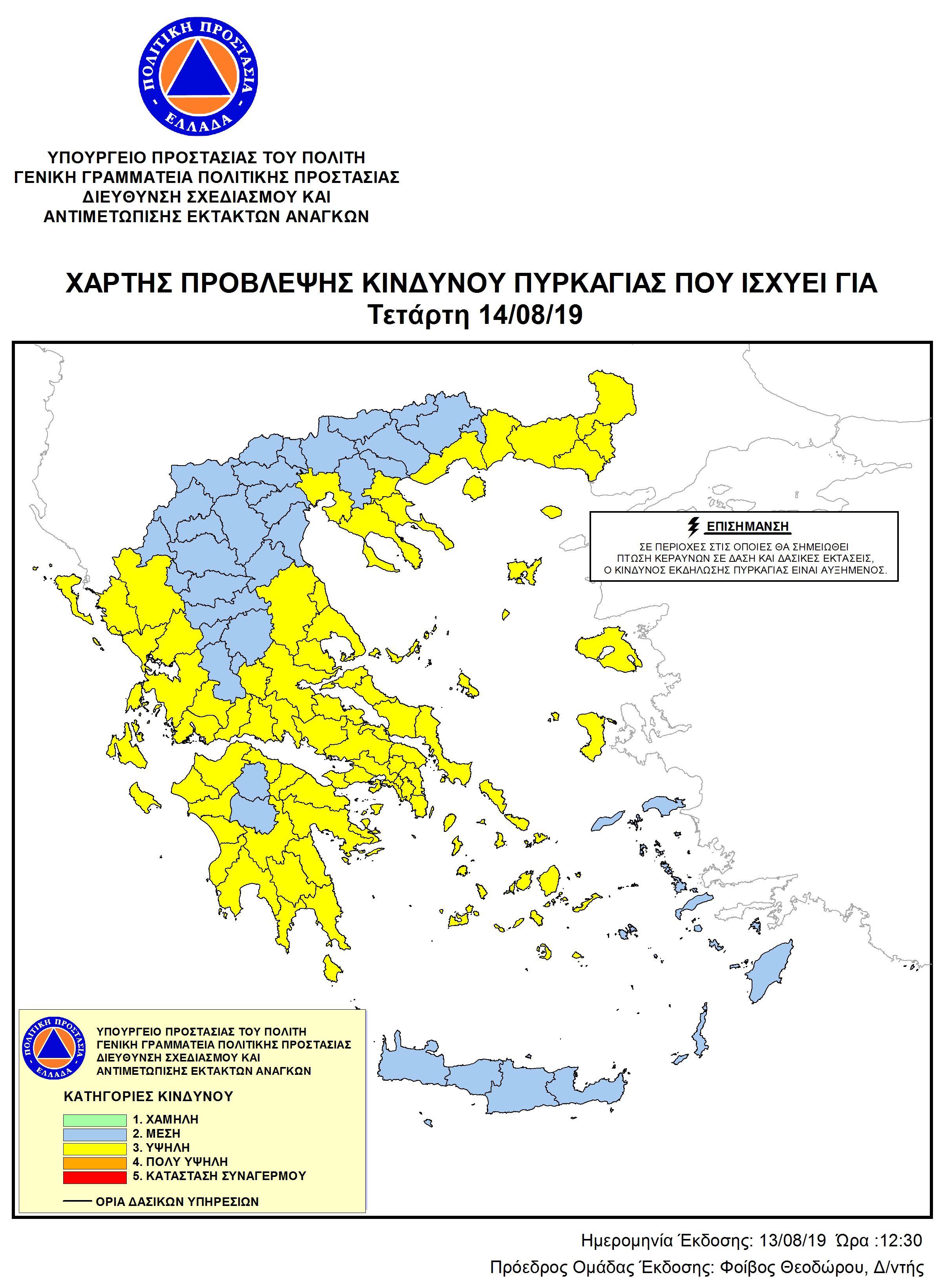 Σύμφωνα με πρόβλεψη της Γενικής Γραμματείας Πολιτικής Προστασίας στην περιοχή της Δυτικής Ελλάδας, οι Περιφερειακές Ενότητες Αιτωλοακαρνανίας, Αχαΐας και Ηλείας, την Τετάρτη 14 Αυγούστου 2019, θα συνεχίσουν να βρίσκονται στην κατηγορία κινδύνου 3 (υψηλή), όπως φαίνεται στον επισυναπτόμενο ημερήσιο Χάρτη Πρόβλεψης Κινδύνου Πυρκαγιάς.